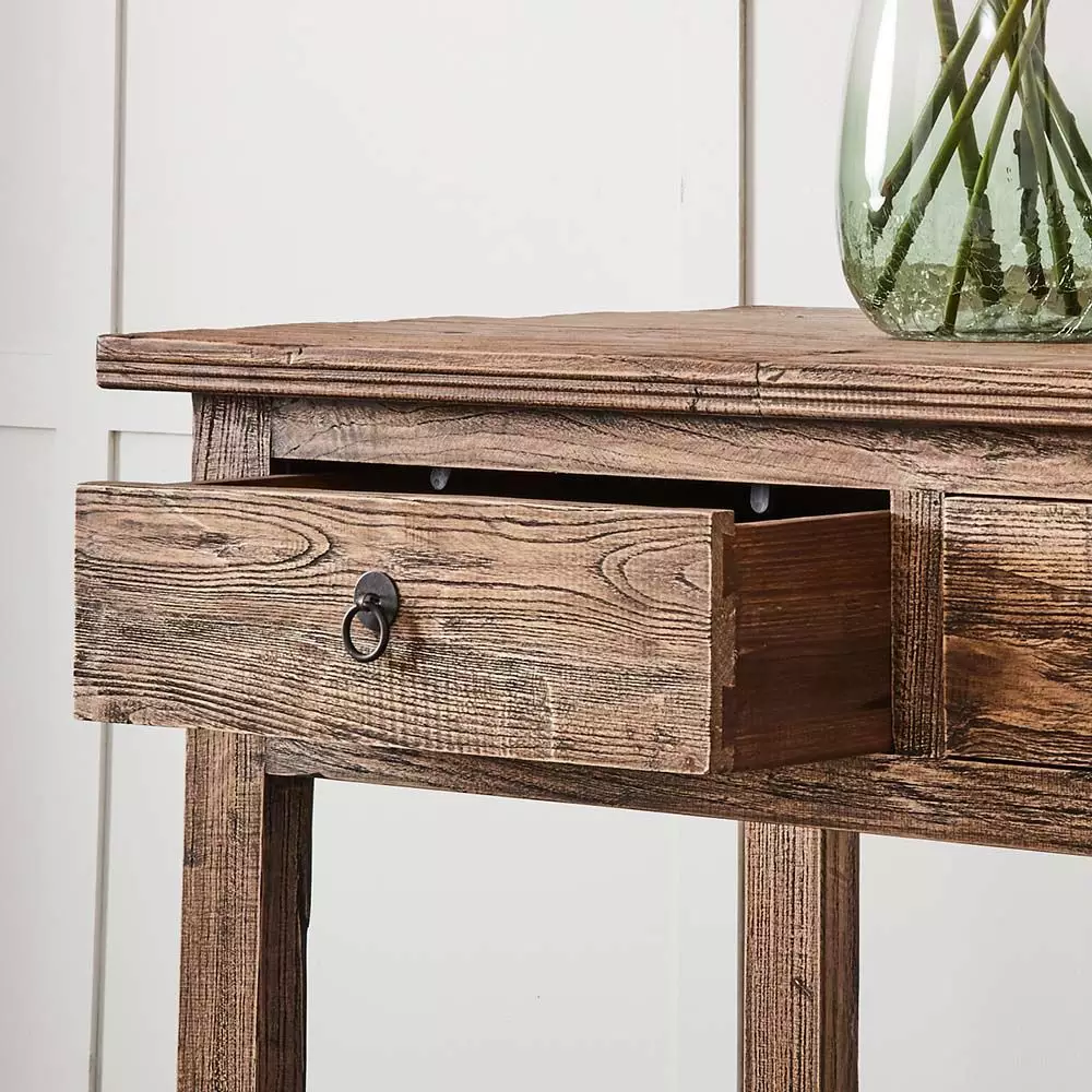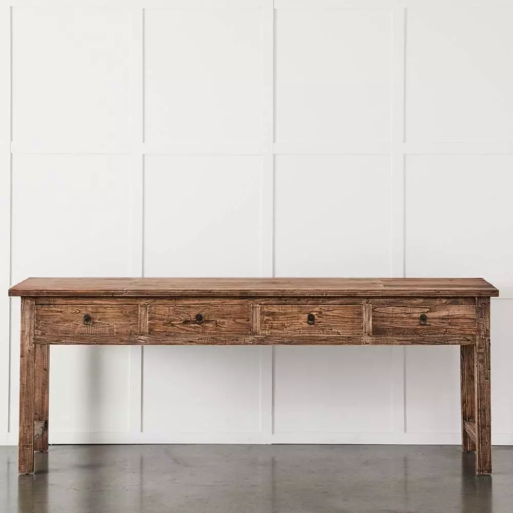 The generous scale of the elm sofa table is complemented by the rustic reclaimed elm used to make it. It’s a solid piece, with 4 handy drawers making it suited to many rooms in your home.