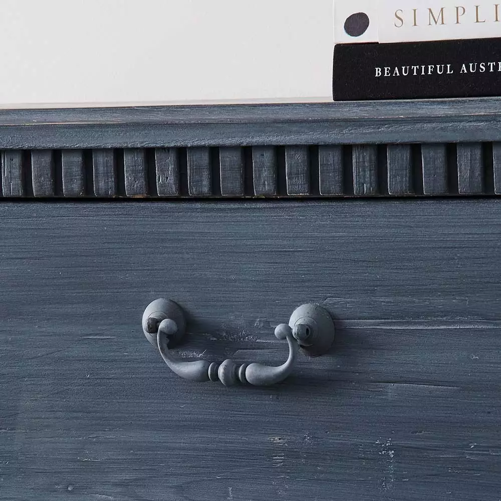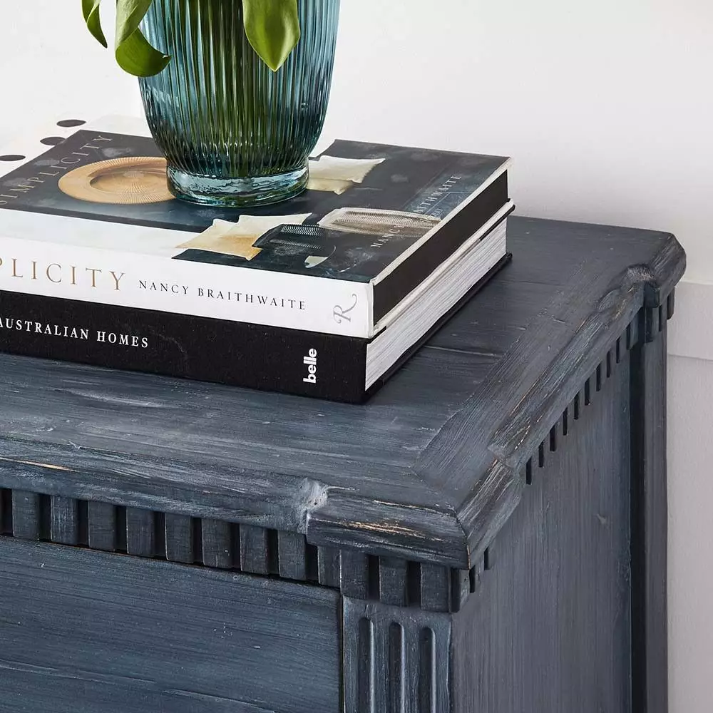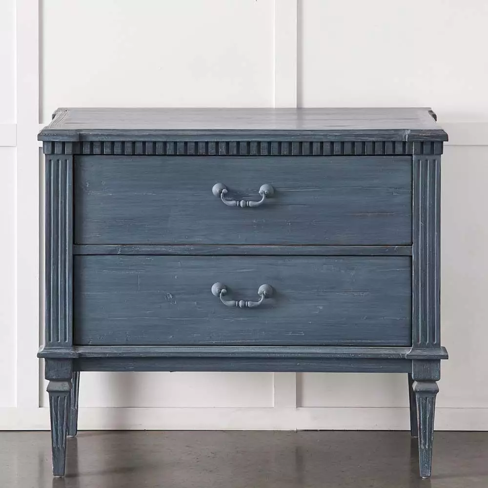 The Albury chest has proportions suited to either a stand-alone chest or the largest of bedsides. The beautiful carved detailing is enhanced with the charming spring blue paint. It has two large drawers, painted a white with blue tinge with metal handles.