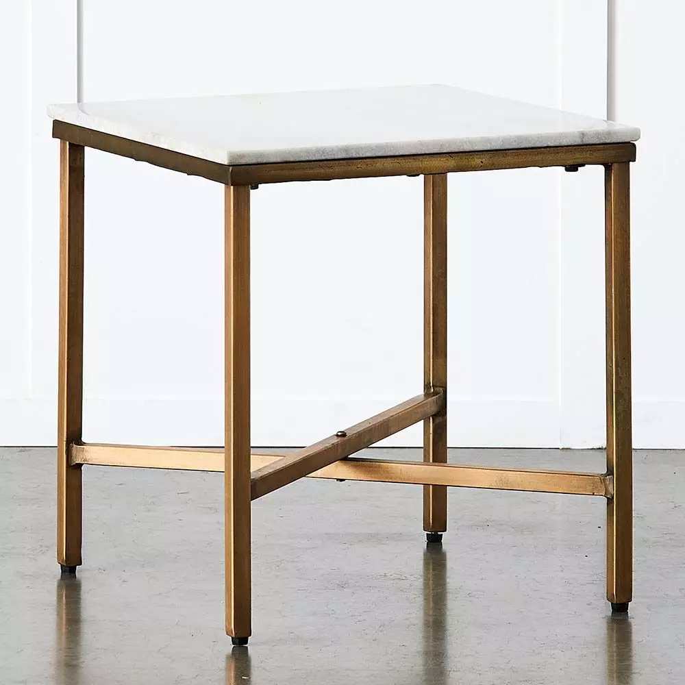 Bristol is an elegant marble topped side table with brass plated iron legs. The slender legs and open feel make it ideal for smaller spaces as it appears to float in a room. The classic colour combination of white and brass is versatile and will look good with almost any style of furniture.