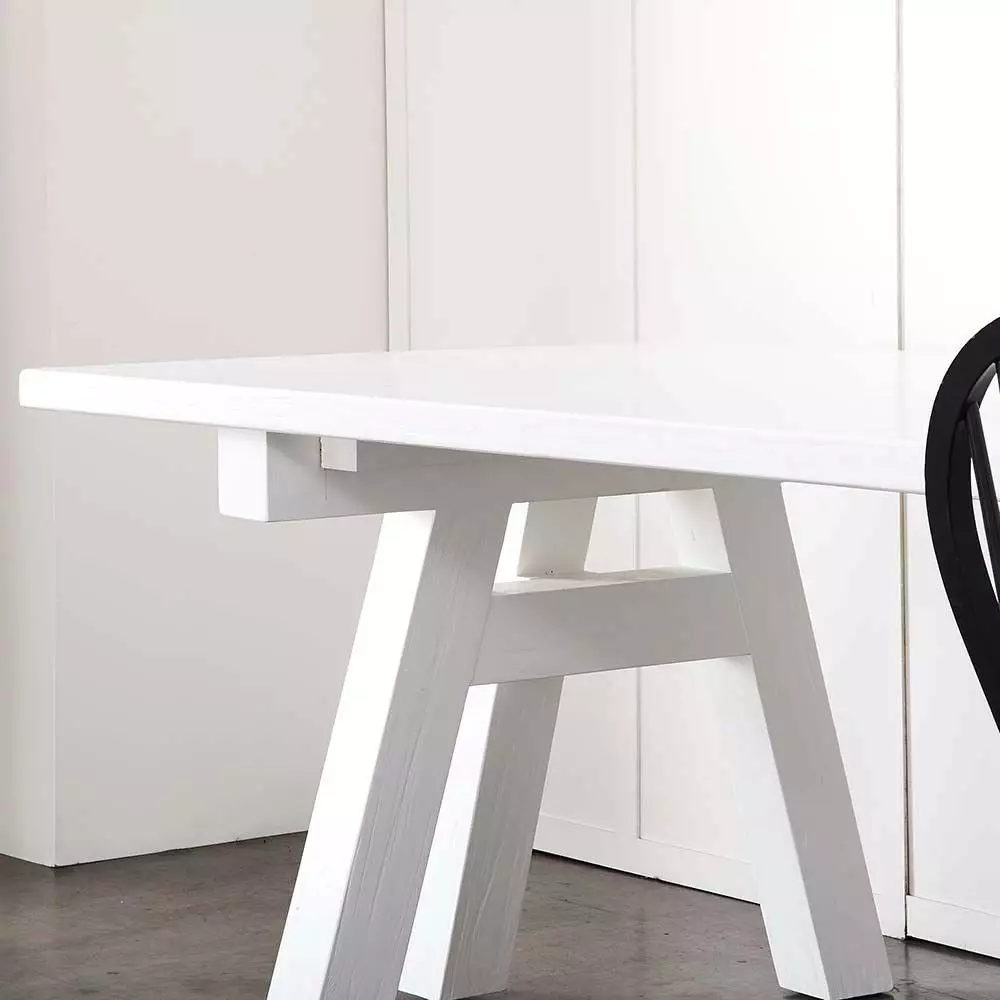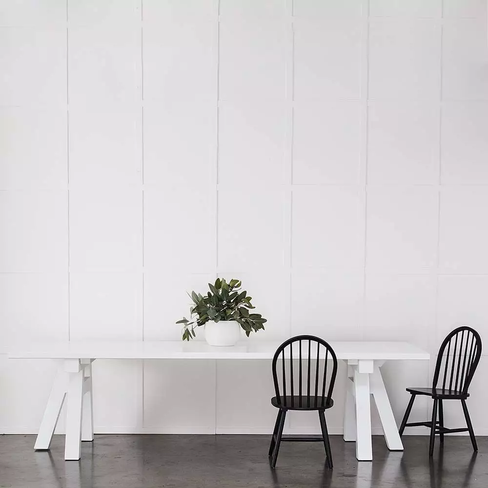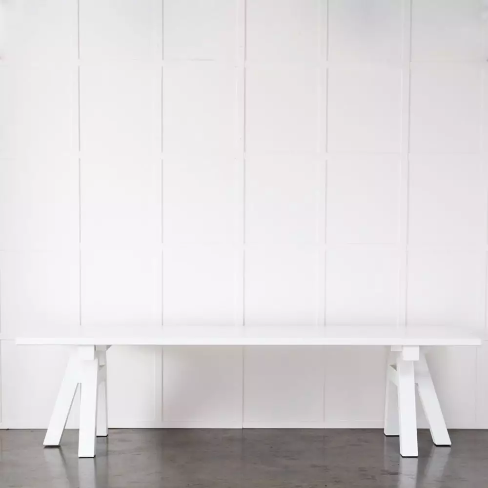 Our Casablanca dining table is a spectacular statement piece at 300cm long. It has a simple, thick white top which is highlighted by the tripod legs at each end.