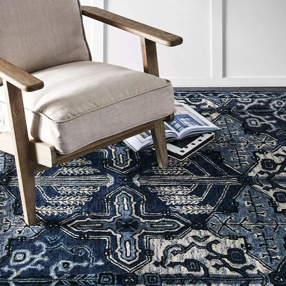A hand woven 100% wool rug that combines indigo tones in a loop textured weave. A lovely rug for grounding a room.