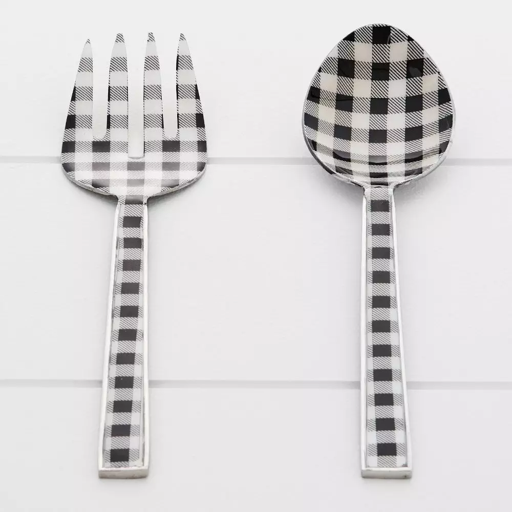 A classic set of salad servers combining stainless steel with food safe enamel.
