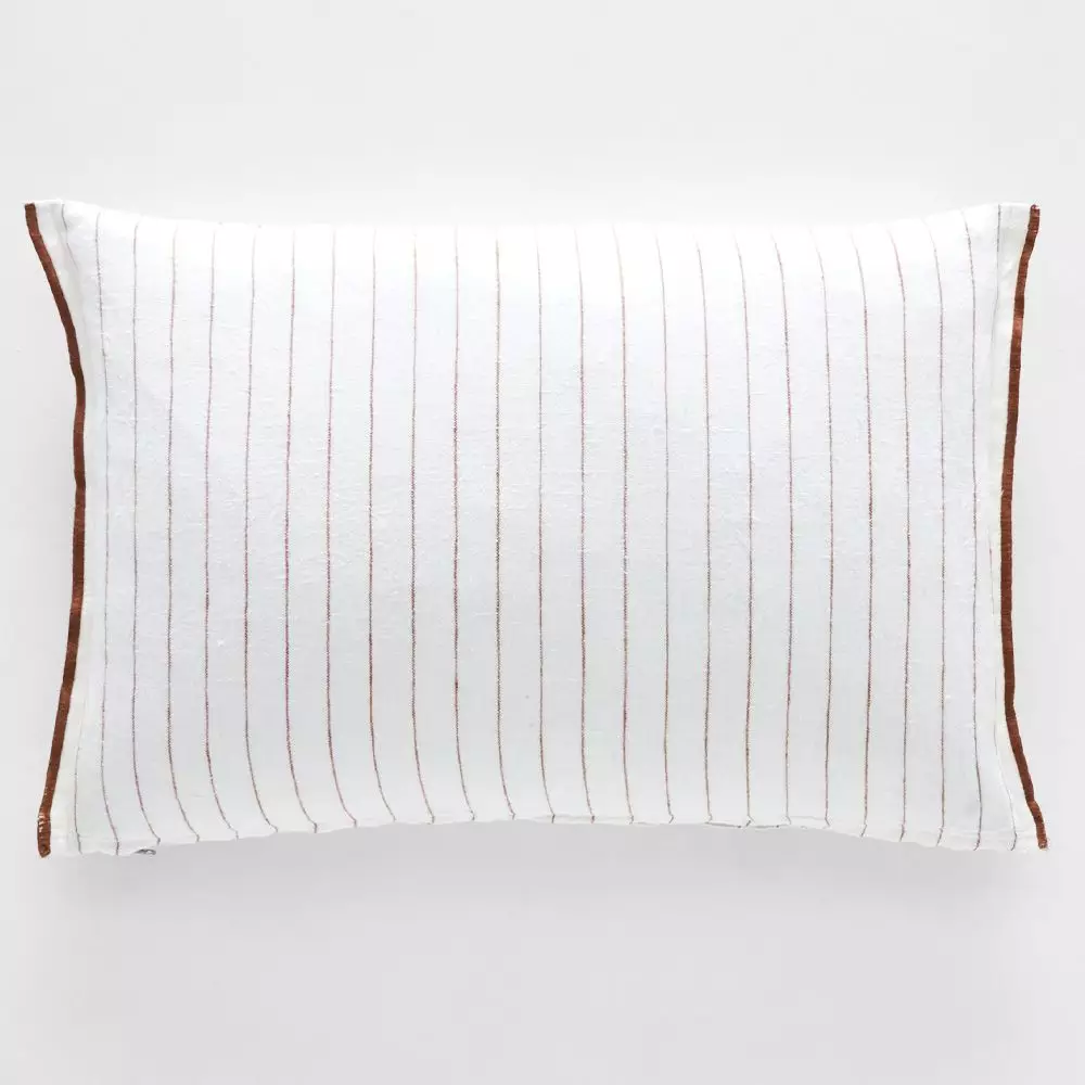 This stylish cushion is made from crisp white linen with fine caramel lines and finished with caramel overlocking on the two ends. The zip is finished with an attractive leather pull and it comes with a feather insert for a luxurious feel. It will look equally at home on the sofa or bed.