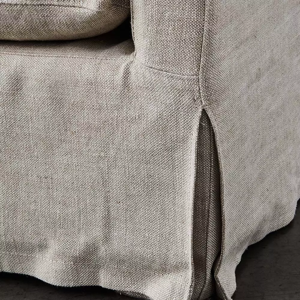 The Kandos armchair is a large, elegant chair upholstered in a thick, textured linen fabric with classic pleating on the bottom corners. The sturdy frame is constructed from beech and pine wood. The comfortable seat cushion is a mixture of feather and polyester to help retain the shape. Three matching throw cushions complete the chair. Curl up by yourself, but at 120cms wide – it’s large enough to share.