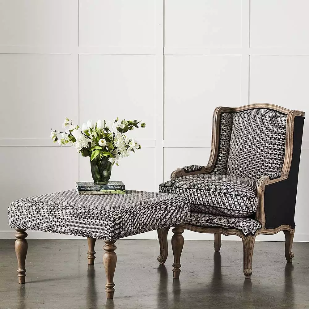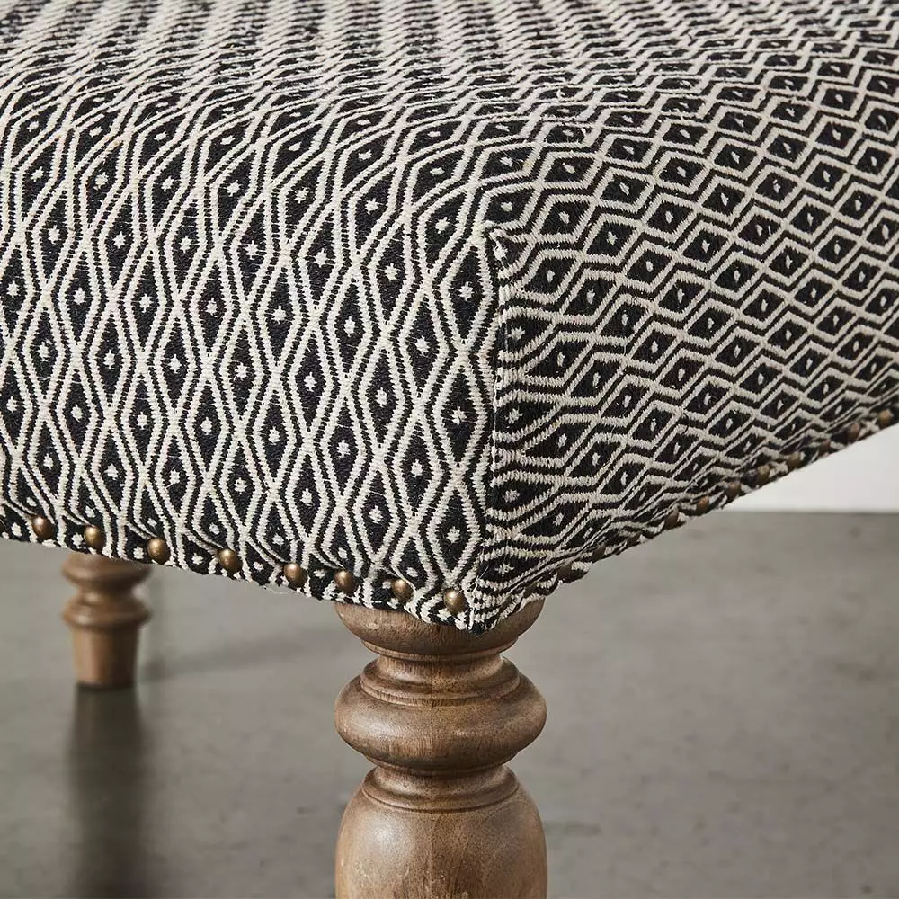 The Khadi ottoman is a versatile piece of furniture – it can be used as an ottoman or a coffee table. The legs are beautifully crafted from sustainable mango wood and left with a raw, natural finish. The top is upholstered in a luxurious velvet with brass studding and filled with quality foam and poly fibre. It will easily find a place in any room.