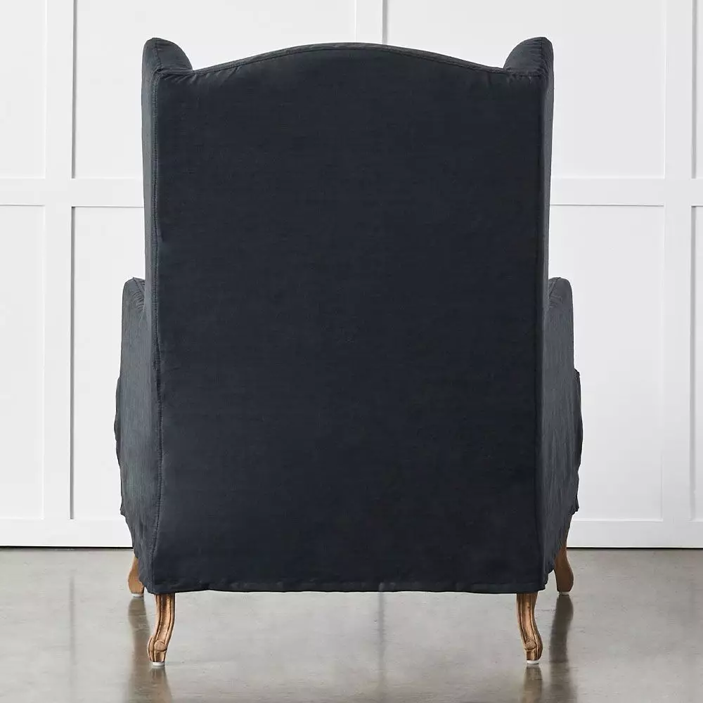 The Ludwig is an elegant mid-sized wingback chair with our signature French style frame and legs but with a twist. It has a removable slipcover in a lovely linen fabric which covers the frame but leaves the intricately carved American oak legs visible. The matching lumbar cushion adds to the comfort of the chair as does the top-quality foam used for the padding.