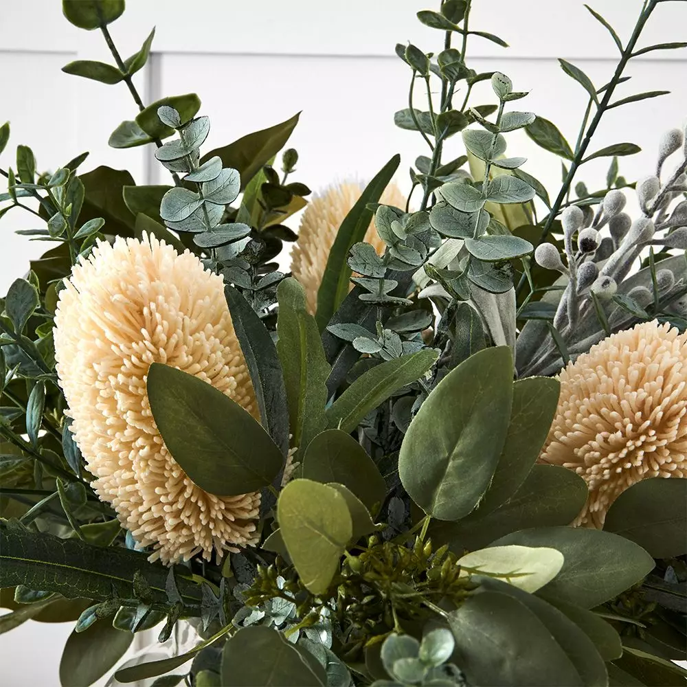 This superb arrangement of Australian natives in a clear glass vase looks so real with the addition of gel in the bottom. The gel looks like water and holds the flowers securely in the lovely arrangement.