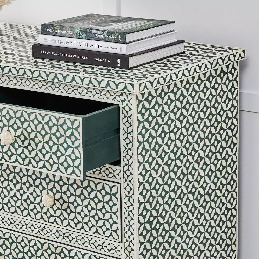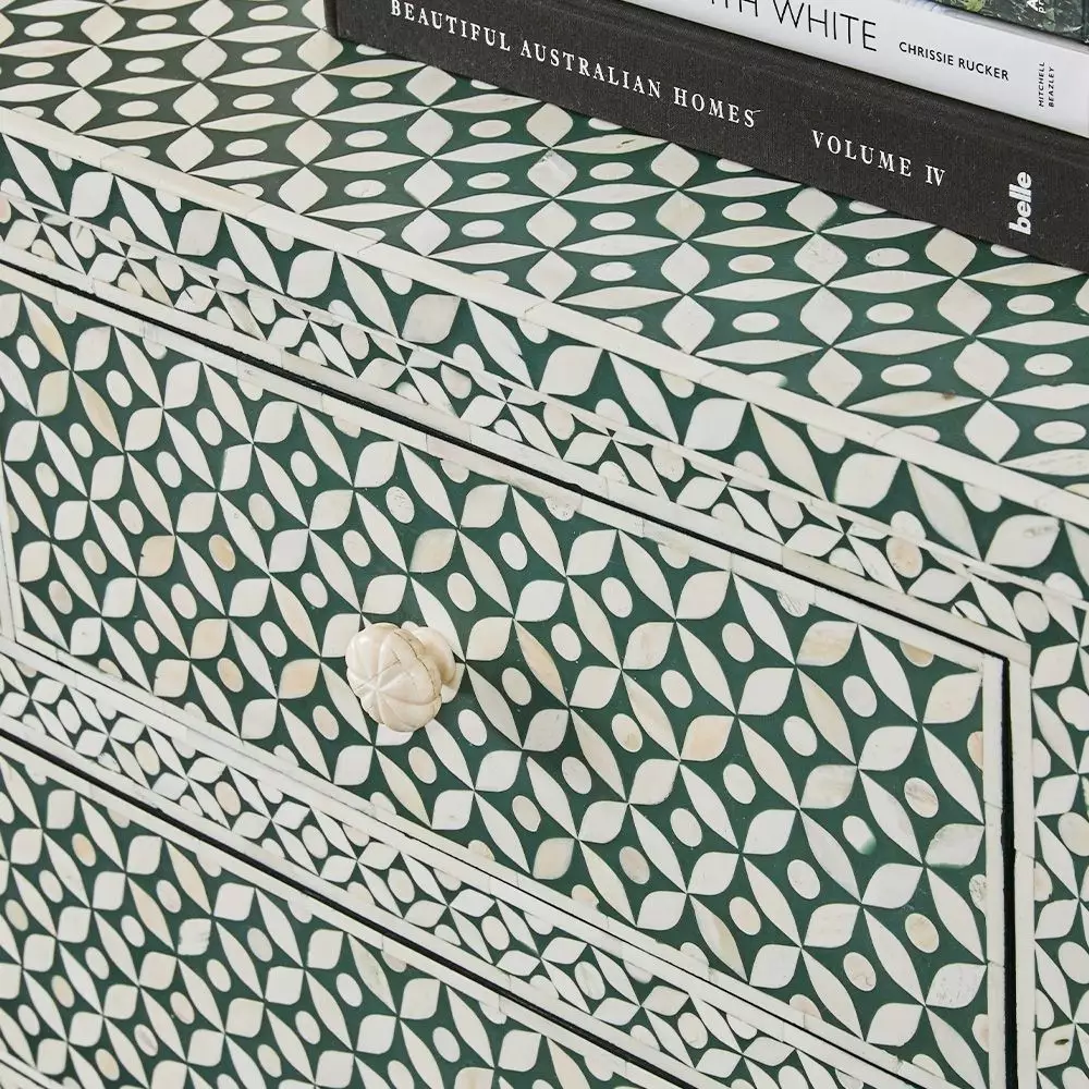 A striking chest of drawers crafted from ethically sourced bone and gorgeous green resin. The superb craftsmanship exemplifies skills passed through generations. Natural colour variations in bone and resin are normal, with patterns varying among artisans. With 2 small and 2 large drawers, it’s not only a beautiful piece of furniture – it’s practical too. An investment piece to be enjoyed for years to come.