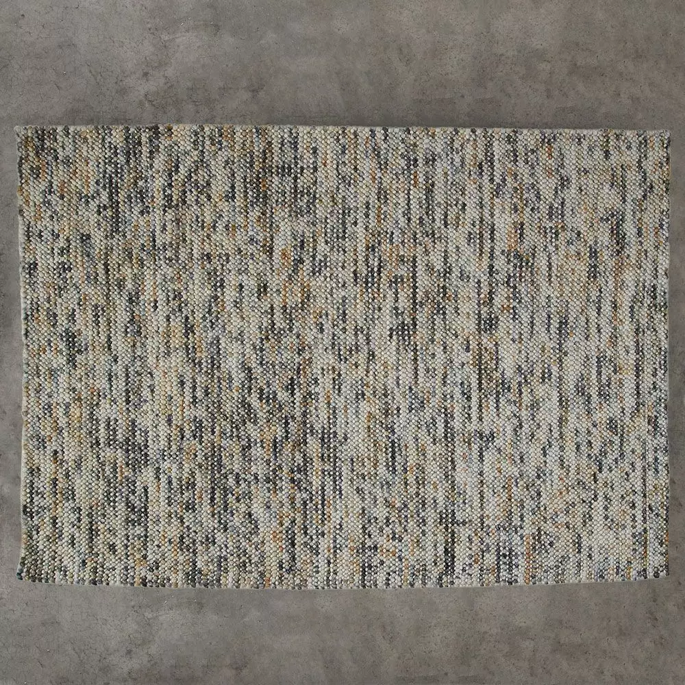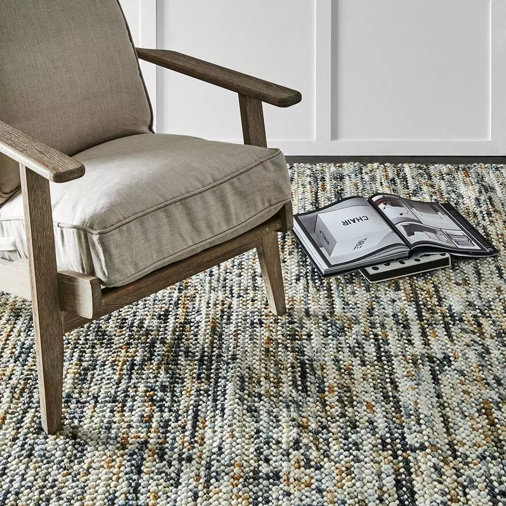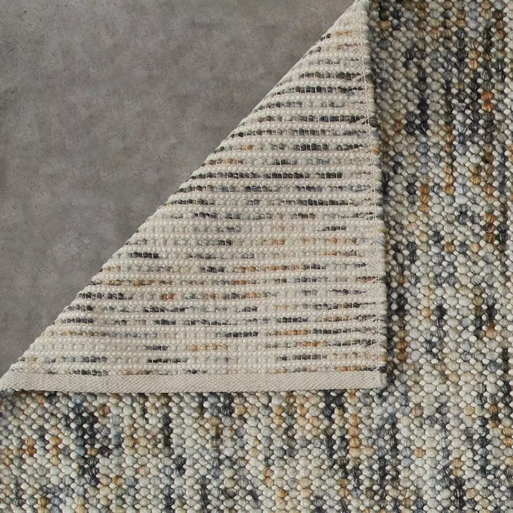 A hand woven 100% wool rug that combines soft blues, saffron, grey and ivory tones in a loop textured weave.