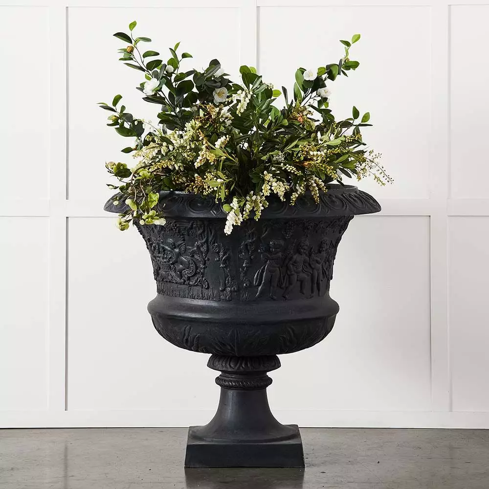 This sophisticated urn is a welcome, decorative addition to any home or garden. Made from fibre glass so the weight is not too heavy for balconies. In a lead colour which looks good with all coloured foliage or flowers.