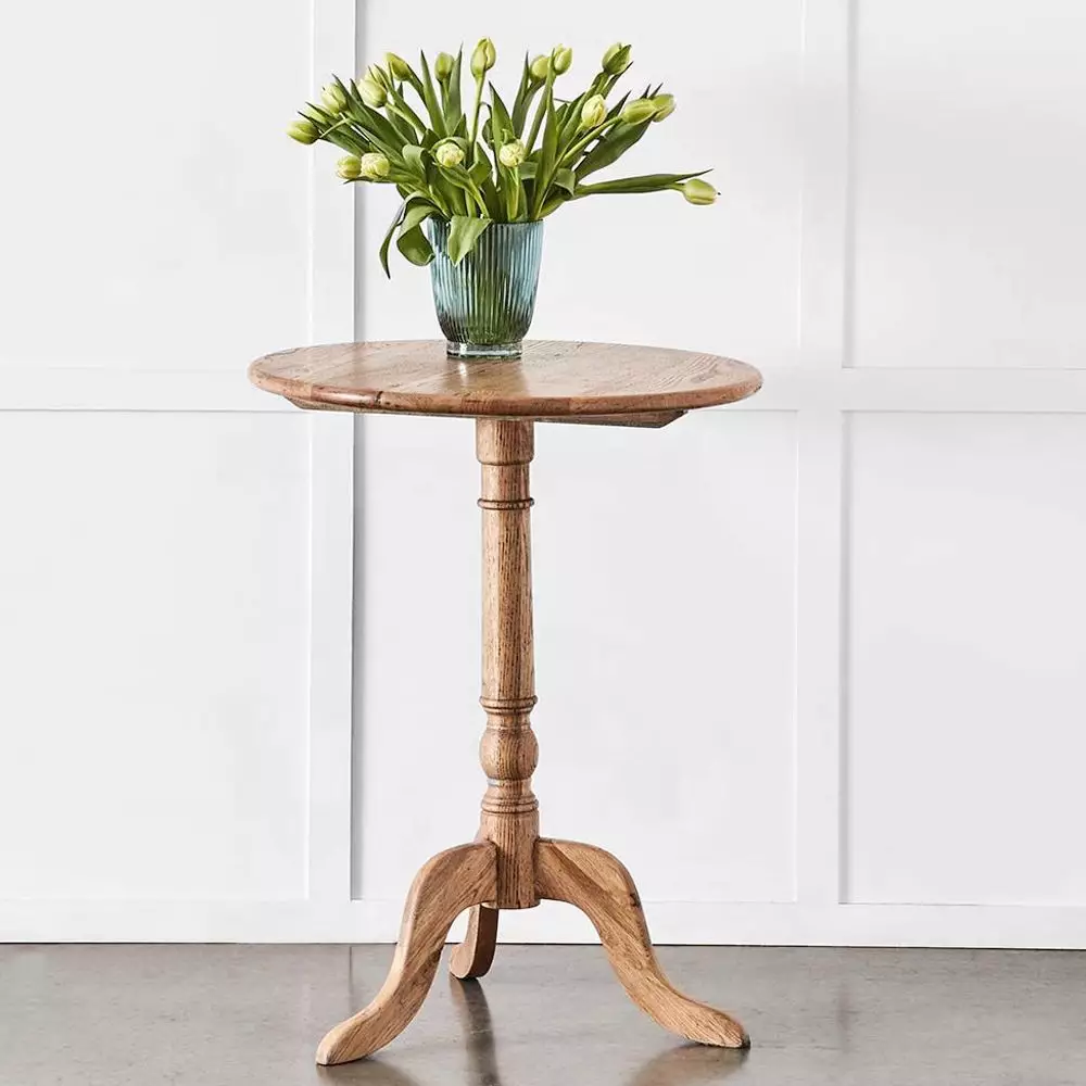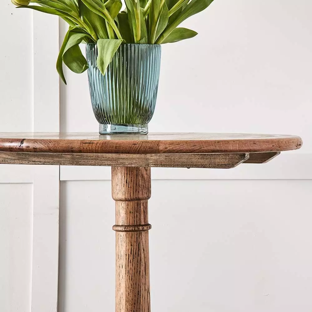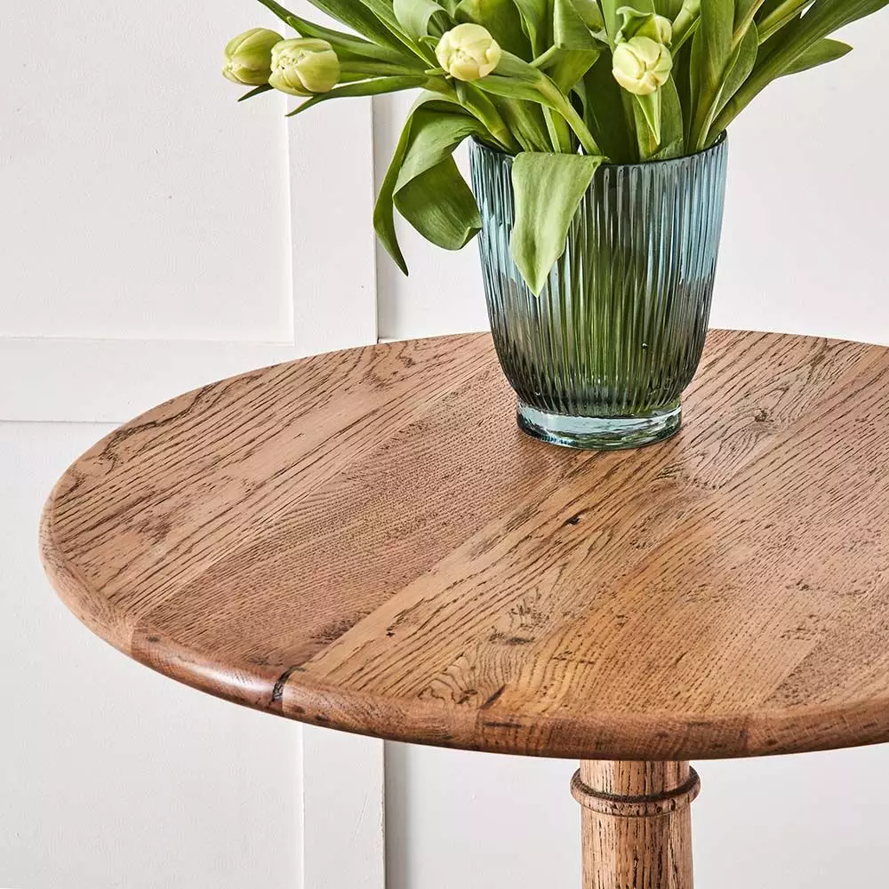 This classic American round fliptop table makes a stylish lamp or bedside table which can be stored away efficiently when space is required. Carefully crafted from oak to display the grain of the timber. The top is has a 60cm diameter.